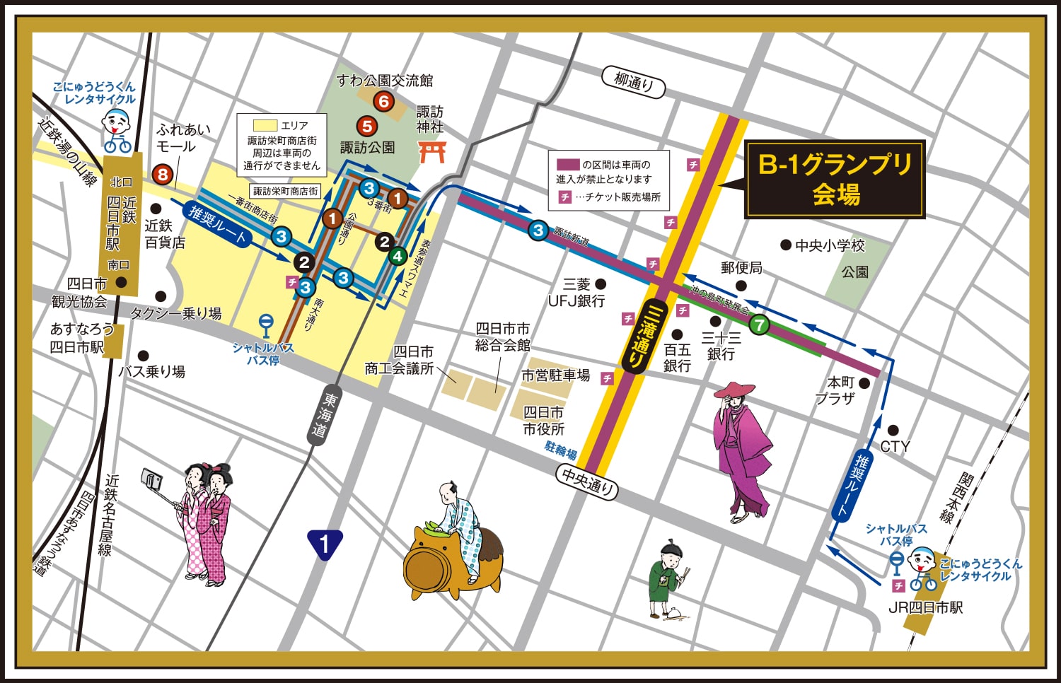 四日市の中心市街地商店街が一体となって、マルシェ、フリマ、体験ブース、キッチンカー、ふわふわ遊具、ミニ縁日などの出店を募り、街全体でB-1グランプリの来場者をおもてなしします。