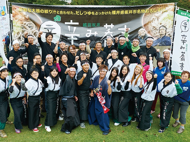 福井県坂井市内で定着している大根おろしの絞り汁にダシを合わせたつゆをぶっかけて食べる蕎麦が「越前坂井辛み蕎麦」です。この伝統的なご当地グルメで坂井市をPRするまちおこし団体が「越前坂井辛み蕎麦であなたの蕎麦で辛み隊」です。地域の街おこしに繋げようと全国各地で市民の機運を高める活動を実施しています。